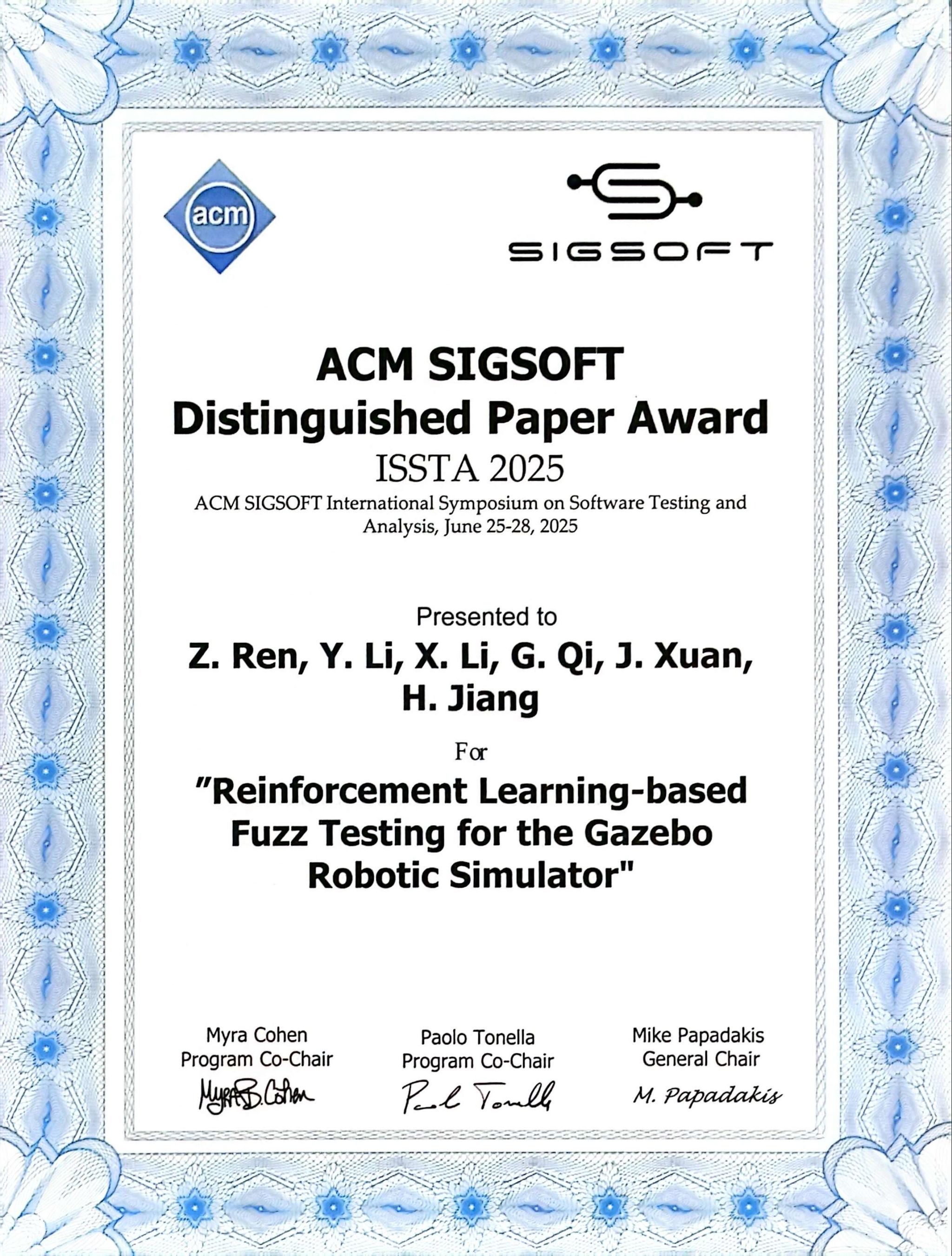 近日,第34届软件测试与分析国际会议ACM SIGSOFT International Symposium on Software Testing and Analysis(ISSTA 2025)在挪威特隆赫姆举办。软件学院、国际信息与软件学院先进工业软件与软件工程研究所江贺教授团队的任志磊教授所著论文《基于强化学习的Gazebo机器人仿真器模糊测试》(Reinforcement Learning-Based Fuzz Testing for the Gazebo Robotic Simulator)荣获杰出论文奖(Distinguished Paper Award)。论文通讯作者为我校江贺教授和任志磊教授,李晓晨副教授和博士生齐观潇、硕士生李一韬参与了技术设计与实现研究。武汉大学玄跻峰教授提供了实验支持。本研究得到国家自然科学基金重点项目资助,成果为机器人仿真器及相关复杂系统的可靠性保障提供了新的解决思路和技术支持。