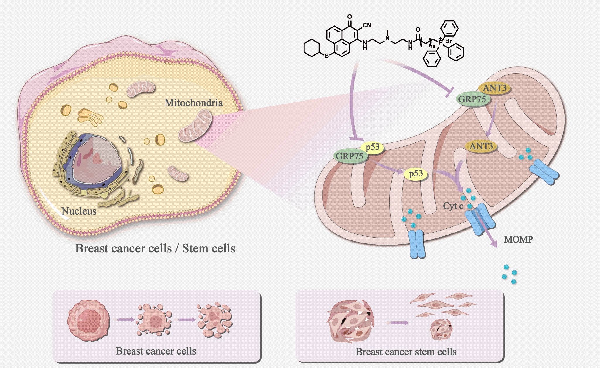 现有HSP70抑制剂的主要问题是对HSP70家族多种亚型蛋白的泛抑制会导致正常组织毒性。亚型蛋白高度同源的序列为亚型特异性抑制剂的开发带来了巨大挑战。在本研究中,张志超教授团队创新性地构建了细胞器靶向的HSP70亚型特异性抑制剂:化合物5(特异性靶向线粒体亚型GRP75)和化合物8(特异性靶向内质网亚型GRP78)。利用HSP70亚型特异性抑制剂为工具,通过对比研究发现,线粒体定位的HSP70亚型GRP75蛋白是广谱的乳腺癌抗癌靶标,GRP75抑制剂5通过干扰GRP75与p53、ANT3的相互作用破坏线粒体稳态,诱导乳腺癌细胞凋亡。抑制剂5不仅能高效杀伤目前临床上缺乏有效药物的三阴乳腺癌细胞,还能以20倍高于临床药物Vismodegib的效率清除乳腺癌干细胞,而且对正常细胞无毒性。该研究为克服乳腺癌的耐药、侵袭和转移提供了新靶点、新思路和更具潜力的先导药物。同时,这一系列HSP70亚型抑制剂还为各种HSP70亚型的功能解析、靶标鉴定和抗癌机制研究提供了新的分子工具,为靶向分子伴侣蛋白的药物研发开辟了新方向。