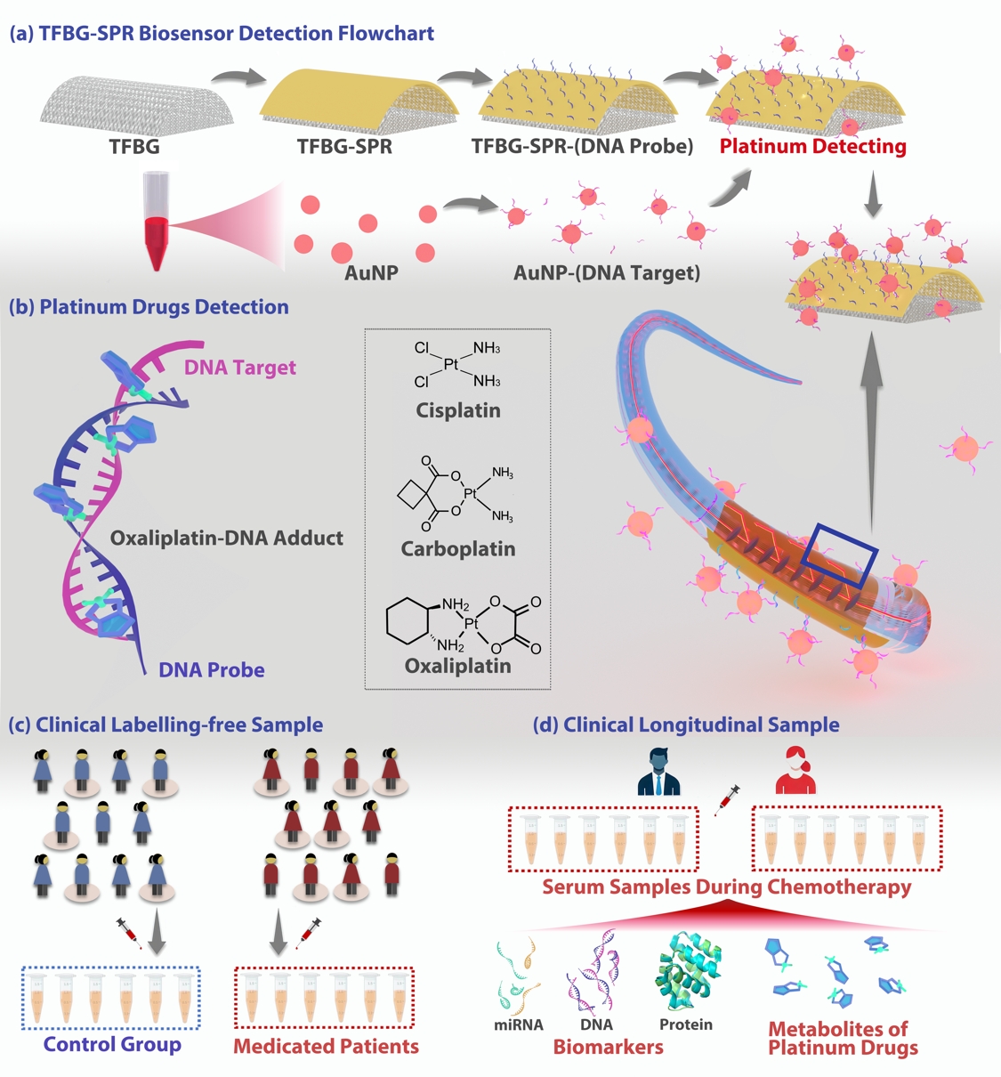 研究团队以倾斜光纤布拉格光栅表面等离子共振(TFBG -SPR)技术的光纤传感元件为核心,结合DNA靶向捕获探针,实现了临床铂类化疗物的高特异性、超痕量POCT检测,为化疗过程中铂药的药代动力学分析提供了有效方案;另外同步开展癌症标志性核酸序列miRNA-21的多组学分析,最终服务于精准化疗的、管理与个体化治疗决策提供动态数据,并首次通过POCT临床快检平台技术发现了铂药和miRNA在预后化疗周期的负相关性。