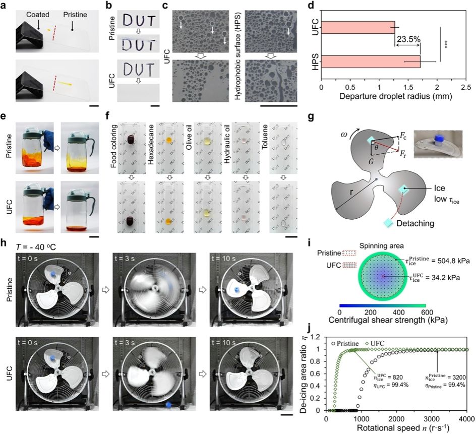 将儿茶酚化学与柔性大分子相结合,不仅为开发普适性分子接枝策略提供了新途径,也揭示了聚合物链构型与其界面滑移行为之间的内在关联。基于此类设计,可通过喷涂、浸渍或刷涂等简便方式在不同基底上快速构建抗粘附表面,并在疏液、防污、集液与除冰等方面表现出持久稳定的性能。此外,该涂层中的硅氧烷主链可被其他柔性链聚合物(如亲水性聚乙二醇、疏水性全氟聚醚等)灵活替代,从而实现对表面功能的按需调控。得益于其简便高效的制备工艺,UFC在多个领域展现出广阔的应用前景,包括日常家用表面(如厨房台面)、可再生能源系统(如光伏面板与风力涡轮机叶片)以及流体输送基础设施(如原油管道)等。