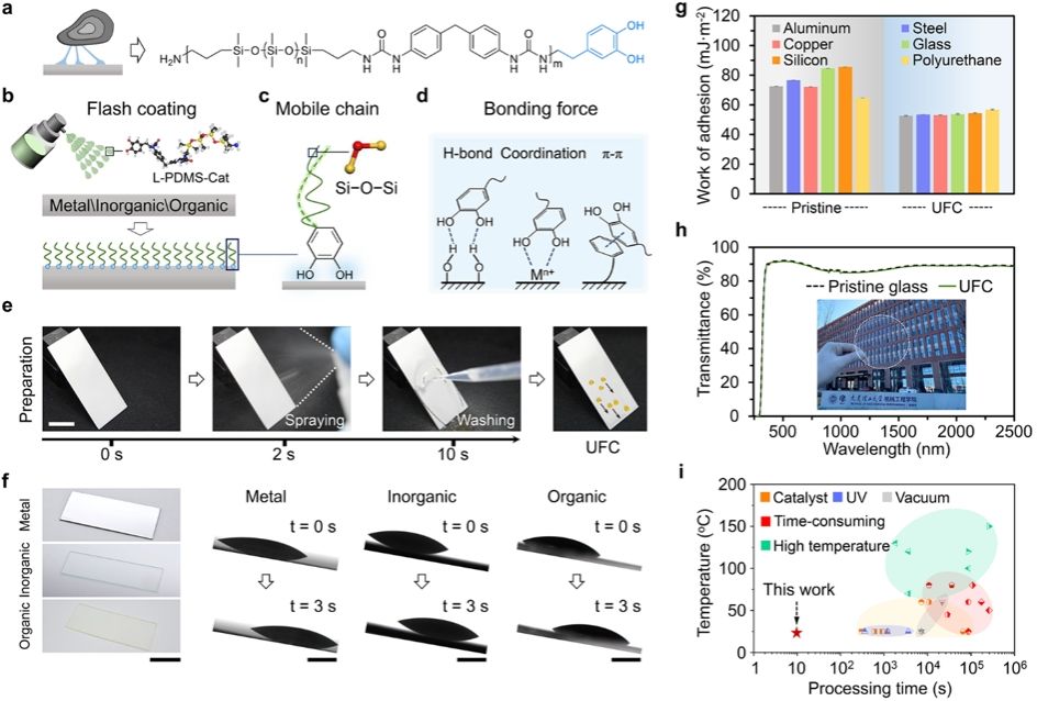 高度柔性的L-PDMS-Cat分子链能够通过简易喷涂工艺,在金属、无机及有机材料等多种基底表面快速固定形成聚合物刷,即通用闪固涂层(UFC)。该分子在表面的锚定作用源于儿茶酚基团与基底之间形成的多重相互作用,包括氢键、络合作用及π–π键。与此同时,分子另一端的Si–O–Si骨架凭借其极低的内旋转势垒,确保了分子链在接枝后仍能保持高度的动态柔性。得益于贻贝粘附机制的启发,该分子链锚定过程无需催化剂或苛刻工艺条件,在常温环境下仅需10秒即可完成类液体表面的构建。通过采用线性聚合物主链的有序设计(末端带有单个儿茶酚基团),锚定在表面的聚二甲基硅氧烷分子得以保持刷状、非交联的理想构象。这一结构特点使UFC表面呈现出类液体特性,具体表现为极低的液体接触角滞后(CAH Δθ5°),以及极低的冰剪切强度(τice= 16.7 ± 10.5 kPa)。