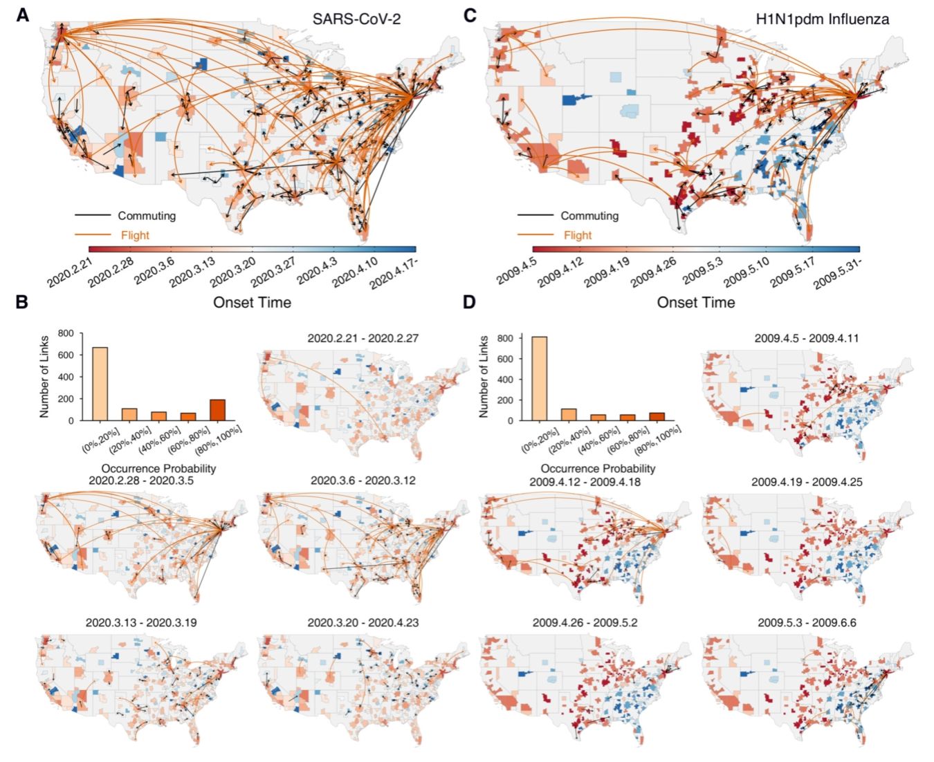 理解新兴呼吸道病毒的早期地理扩散路径对于有效应对未来大流行至关重要。然而,由于早期监测数据的稀缺性和传播的强随机性等因素,H1N1流感病毒与新冠病毒在美国的早期隐秘传播动态长期以来不甚清晰。该研究团队创新性地整合了高分辨率疾病数据与人口流动信息,融入病原体的超级传播关键特性,开发出基于随机传播模型与集成推断算法的贝叶斯推断分析框架。研究发现,尽管两种病毒的传播网络均呈现“枢纽-辐射”结构,但其核心传播路径存在显著差异。新冠病毒早期以西雅图与纽约为核心枢纽,通过航空旅行实现全国性扩散,而H1N1流感病毒则形成了独特的多枢纽协同传播模式。
