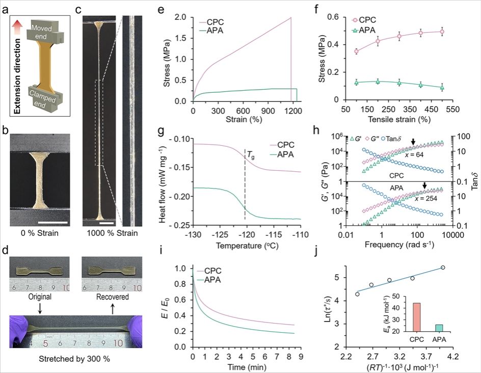 力学测试表明,CPC在保持1100%高延展性的同时断裂强度达2.0 MPa,相比APA和PPP分别提升571.1%和121.2%。流变学与应力分析显示,CPC体系具有更高的储能模量、更低的流动转变频率(64 rad s-1)以及更慢的应力松弛行为(3.83 min),其表观活化能为44.3 kJ mol-1。端基约束策略通过抑制链间滑移增强熵弹性贡献,实现了本体材料韧性、抗蠕变性与弹性恢复能力的协同提升。