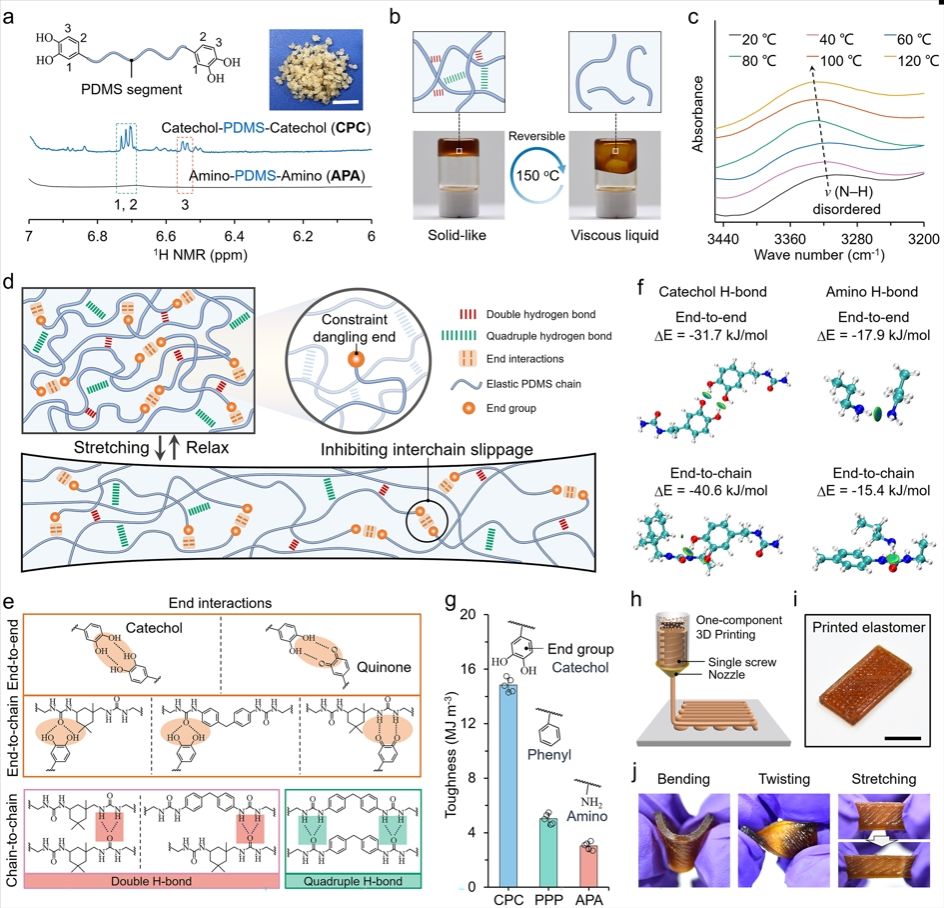 通过向分子链末端引入儿茶酚基团,在链端形成双齿氢键,建立有效的端基约束。为揭示端基约束的作用机制,构建了三种端基修饰的PDMS对比体系,分别为儿茶酚双封端PDMS(CPC)、氨基双封端PDMS(APA)以及苯基双封端PDMS(PPP)。CPC韧性达14.8 MJ/m3,相比APA与PPP分别提高388.2%和195.6%。在熔融颗粒(FGF)3D打印过程中,CPC仍保持良好的柔韧性与形变恢复能力,说明该端基强化策略可在保持加工性能的同时提升弹性体的力学性能。