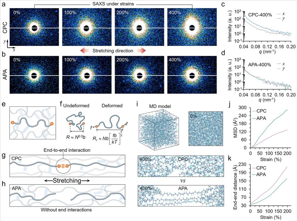 结合原位拉伸小角X射线散射(SAXS)与分子动力学模拟对弹性体网络的拉伸变形行为进行了深入分析。链端受限的CPC在拉伸中由无规卷曲逐渐取向,呈现显著各向异性;而对照体系APA保持各向同性。这表明链端约束在分子链末端引入了额外的有效受力点,促进分子链的伸展与取向,抑制链间滑移。在400%应变下,CPC均方位移为135 Å2(APA为290 Å2),均方根末端距220 Å(APA为160 Å)。上述结论证实了链端运动受限驱动滑移抑制–熵弹性增强的协同机制。