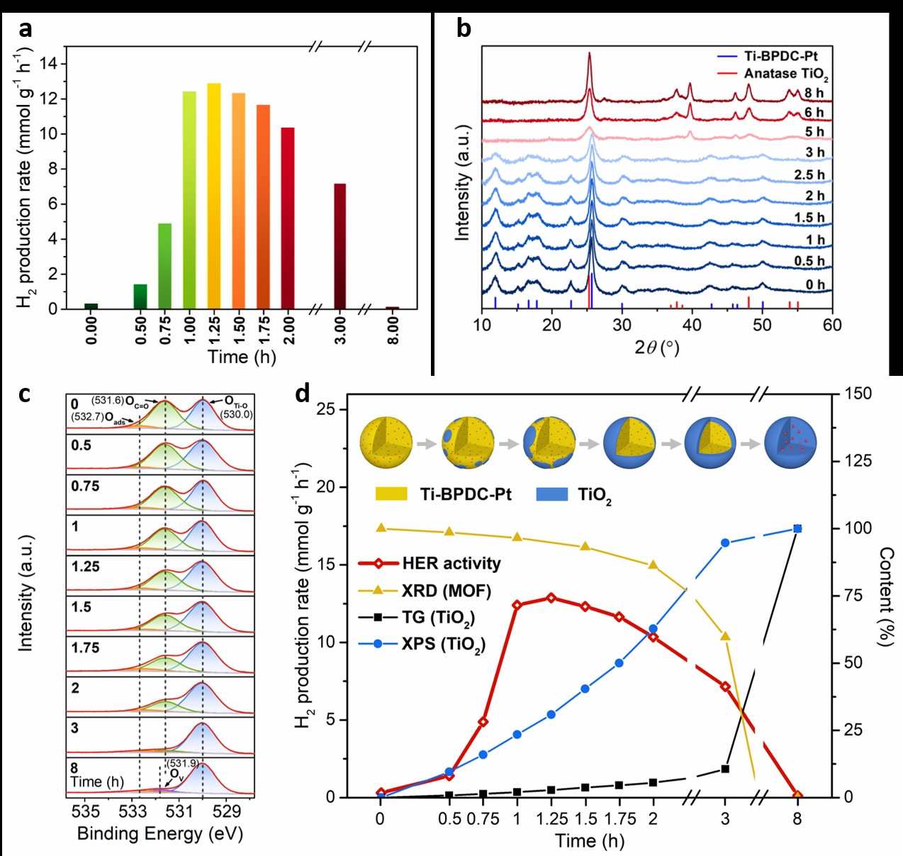 太阳能驱动水分解是生产清洁可再生氢能的潜在长期战略。自从发现TiO2的光催化性能以来,由于其优异的稳定性和无毒性,成为研究最广泛的光催化剂之一。驱动光催化反应需要三个主要步骤,即光激发、电荷分离和迁移以及表面反应。研究人员通过掺杂和构建缺陷将TiO2的光响应扩展到可见光区,通过构建异质结改善光生电荷和空穴的分离,通过加载助催化剂促进表面反应,任一单独的性能优化步骤中都取得了巨大的进展。但由于各组分之间的相互干扰,考虑所有因素以设计高效催化剂仍然是一个巨大的挑战。MOFs由于其高比表面积和可调控性,在过去十年中引起了光催化领域的广泛关注。据报道,特定配体能够实现金属螯合,起到助催化剂作用。此外,MOFs还能够制备含缺陷的氧化物半导体。在此基础上可以假设,通过精细控制MOFs有机组分的热解,能够形成由Ti-MOF和从Ti-MOF中原位生长的TiO2组成的异质结,此时作为助催化剂的大量金属位点可以选择性地固定在异质结的Ti-MOF相上,而不接触原位生长的TiO2。考虑到各组分之间的互不干扰,该催化剂被认为是一种高效的光催化系统。
