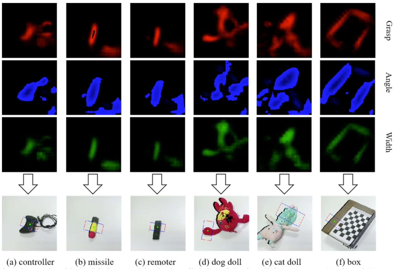 机器人抓取识别效果展示,输入为RGB-D图像,输出可视化为抓取矩形框