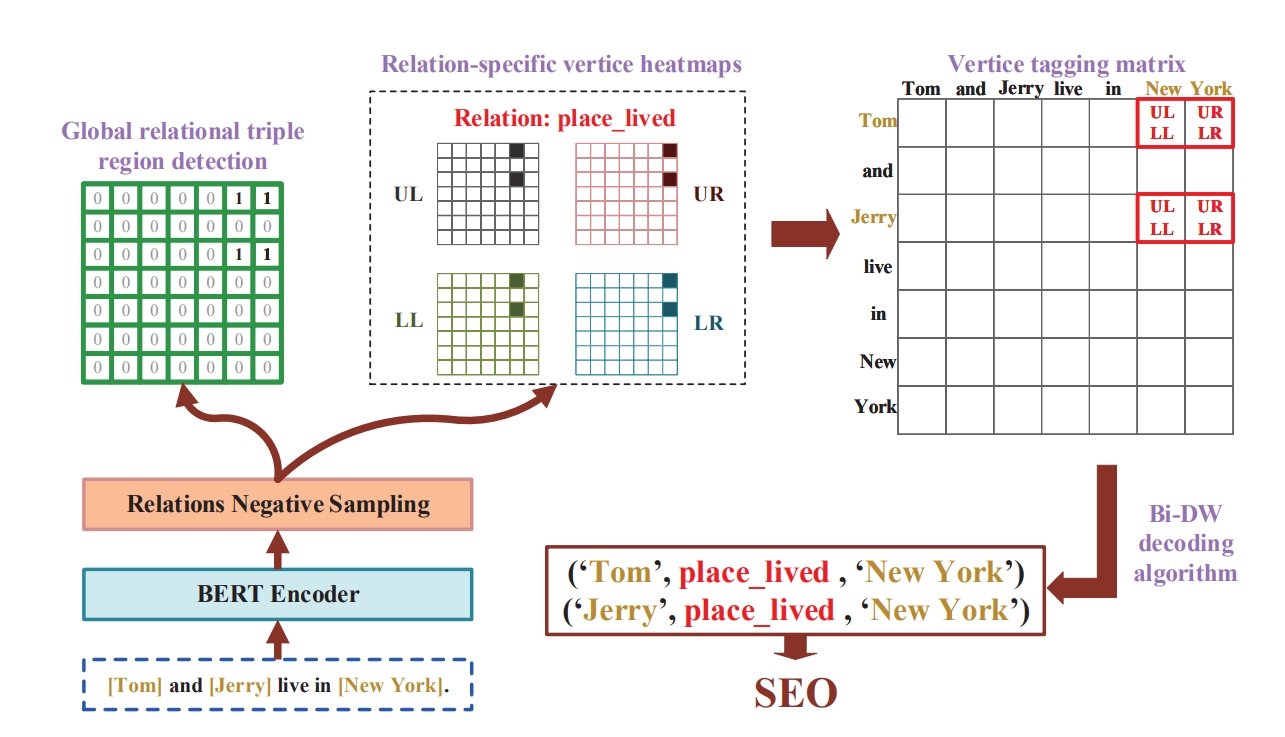 关系三元组抽取(RTE)任务是一项基础且重要的信息抽取任务。最近,基于填表的RTE方法受到了很多关注。尽管基于填表的信息抽取方法取得了成功,但仍存在一些固有问题,例如未充分利用三元组的区域信息。在这项工作中,将基于填表方法的RTE任务视为目标检测任务,并提出了一种基于单阶段目标检测框架的关系三元组抽取方法(OD-RTE)。在这个框架中,基于顶点的边界框检测,结合辅助的全局关系三元组区域检测,确保了三元组的区域信息能够得到充分利用。同时,所提出的解码方案可以提取所有嵌套与重叠类型的三元组。此外,在训练阶段的关系负采样策略显著提高了训练效率,同时缓解了正负关系的不平衡。实验结果表明:1)OD-RTE在两个广泛使用的基准数据集(NYT和WebNLG)上实现了最先进的性能。2)与最先进的的表格填充方法相比,OD-RTE实现了更快的训练和推理速度,并降低了GPU内存占用量。