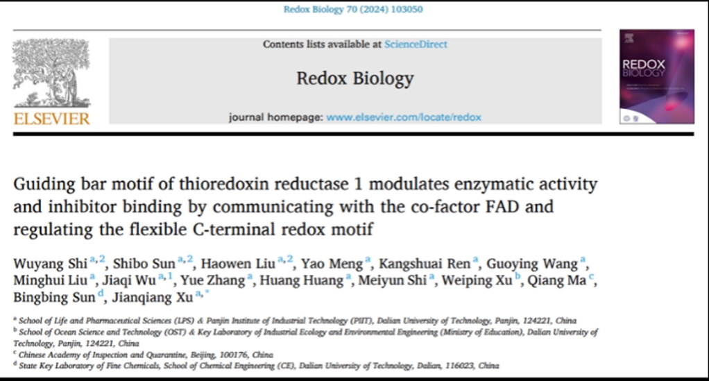 近日,化工海洋与生命学院许建强课题组在生物学领域顶刊《氧化还原生物学》(Redox Biology)发表题为 “细胞质型硫氧还蛋白还原酶的导向杆基序通过与辅因子FAD通讯来调节柔性羧酸端氧化还原基序实现酶活性调控和抑制剂结合” (Guiding bar motif of thioredoxin reductase 1 modulates enzymatic activity and inhibitor binding by communicating with the co-factor FAD and regulating the flexible C-terminal redox motif)的研究文章。2020级本科生时武阳、研究助理孙世博和2021级硕士生柳昊雯是共同第一作者,许建强副教授是唯一通讯作者。