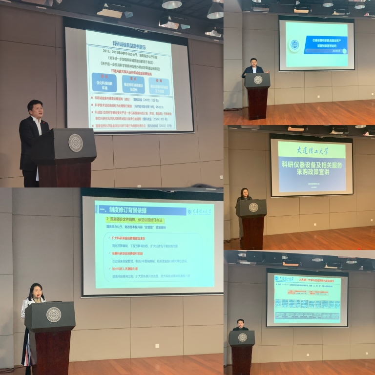 随后,财务处副处长陈桂研、采管办副主任于青、资实处副处长谢睿聪、开发院成果转化科科长郝涛分别就“落实科研‘放管服’精神财务相关制度”“科研仪器设备及相关服务采购政策”“仪器设备和家具类固定资产配置预算管理说明”以及“科技成果转化政策体系”等内容进行了宣讲和解读,对上级部门有关要求的新变化进行了说明和介绍。