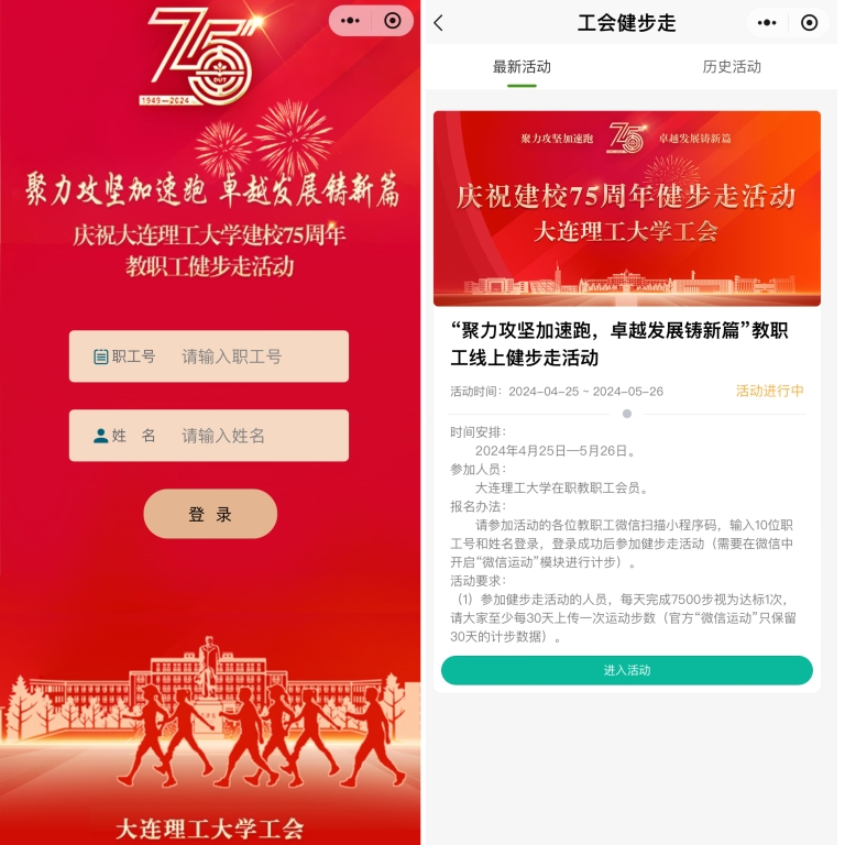 为庆祝建校75周年,落实学校第十四次党代会精神和党委总体工作部署,团结引领广大教职工以健康的体魄和良好的精神面貌为学校事业发展贡献力量,4月25日至5月26日,校工会举办“聚力攻坚加速跑 卓越发展铸新篇”教职工线上健步走活动。