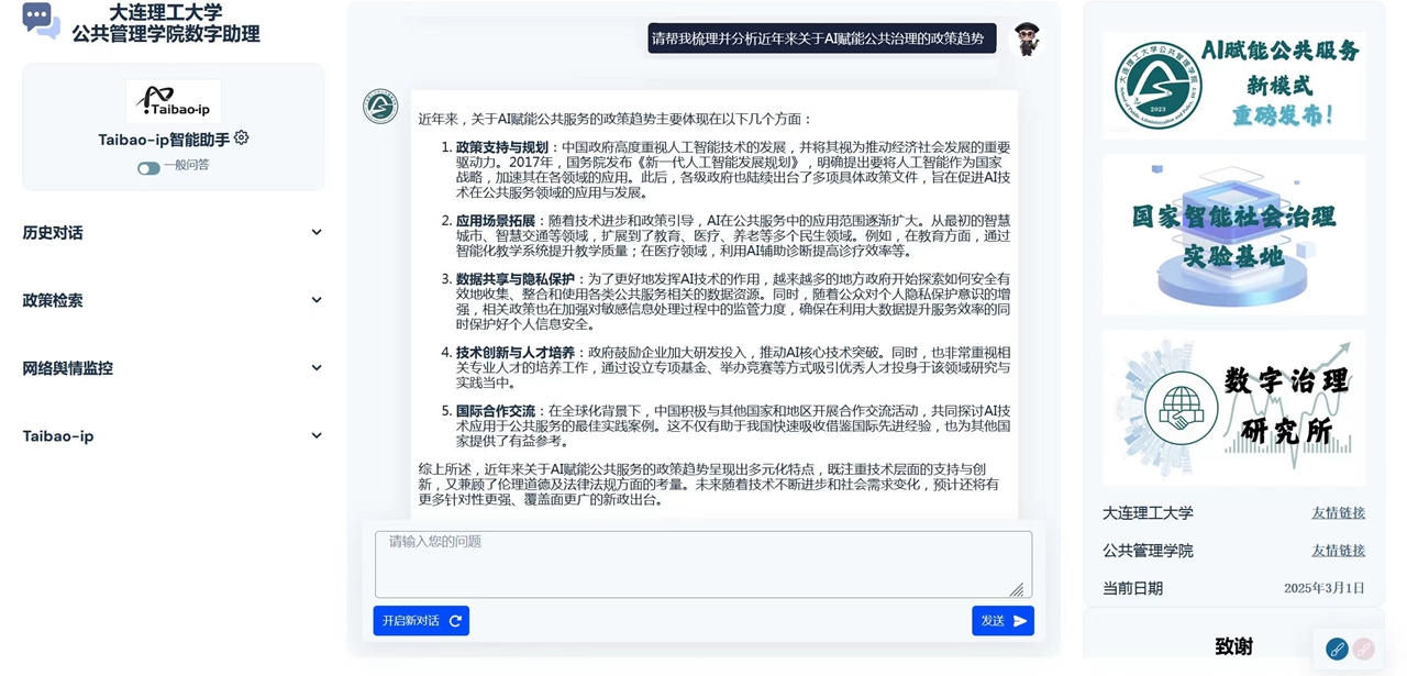 近日,公共管理学院携手国家智能社会治理实验基地(大连理工大学)的Taibao-ip团队,完成DeepSeek大模型本地化部署并构建学院数字助理平台,赋能公共管理学院科研、教学、政务全流程服务。在高校数字化转型与学科交叉融合的背景下,此次部署标志着在公共管理领域人工智能技术应用取得新进展,为科技创新、学科建设与社会服务注入强劲动能。