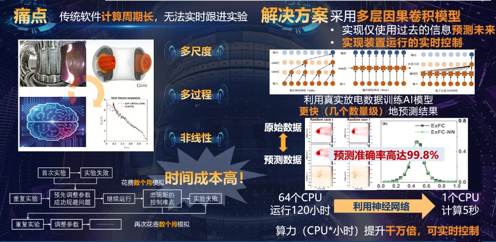 项目简介:本项目以国家重点研发项目为支撑,聚焦受控核聚变装置托卡马克中高度非线性、多场多尺度耦合的复杂物理现象,利用人工智能技术与传统大规模计算机模拟研究方法相结合,针对托卡马克等离子体中宏观磁流体不稳定性的物理机制进行系统性分析,发展优化控制方法,计算效率提高千万倍,预测准确率高达99.8%。相关成果获国家发明专利4项和6项软件著作权,获全国高校首个华为AI技术认证。