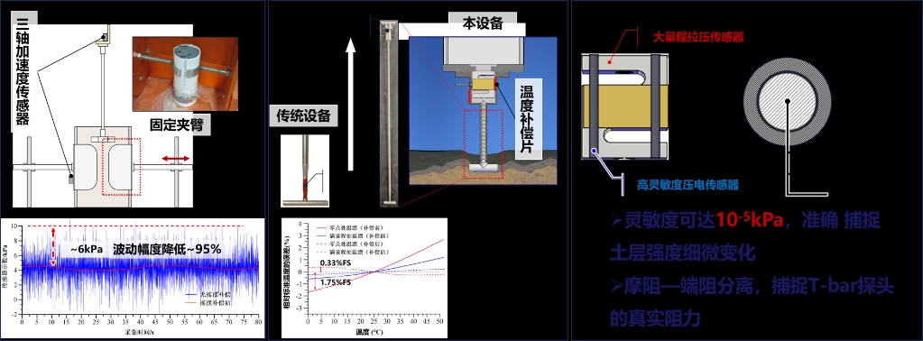 项目简介:自主研发一套高灵敏度、低测试成本的船基海床土临场强度测试装置。与同类设备相比,采用MEMS微应变传感器代替传统的应变式测力元件,减小由温差导致的测量误差达81%。通过高阻力夹具和波动补偿算法,使测试结果波动幅度降低~95%。采用传感器并联—摩擦袖高灵敏机构,为深水海床软土地基提供微力级(0.1kPa)精细化测量精度。该装置应用于渤海、东海、南海44项海上风电建设项目,总装机容量超180万千瓦,进一步推广至渤海、南海水下油气开发中。