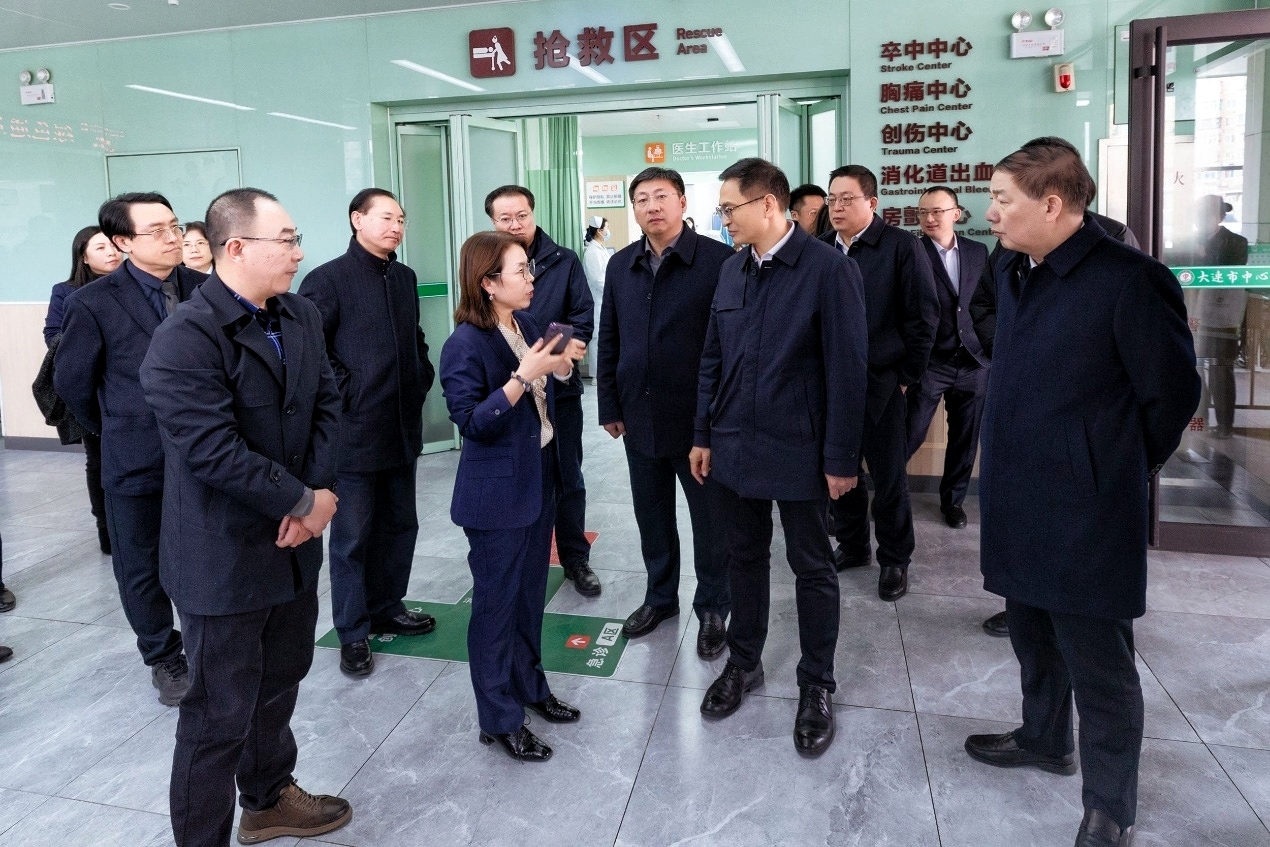仪式后,项昌乐陪同吉训明一行赴附属中心医院开展卒中急救地图建设专项调研并召开现场工作会。吉训明一行在附属中心医院先后参观了新建北院区综合楼项目、呼吸感染楼、卒中中心绿色通道等地,认真听取了急诊医学中心主任纪颖进行的“卒中一站式服务”现场汇报,并深入了解医院卒中中心的总体运行情况。吉训明对附属中心医院在卒中患者的院前、院中、院后管理方面所作出的努力给予充分肯定和高度赞扬。