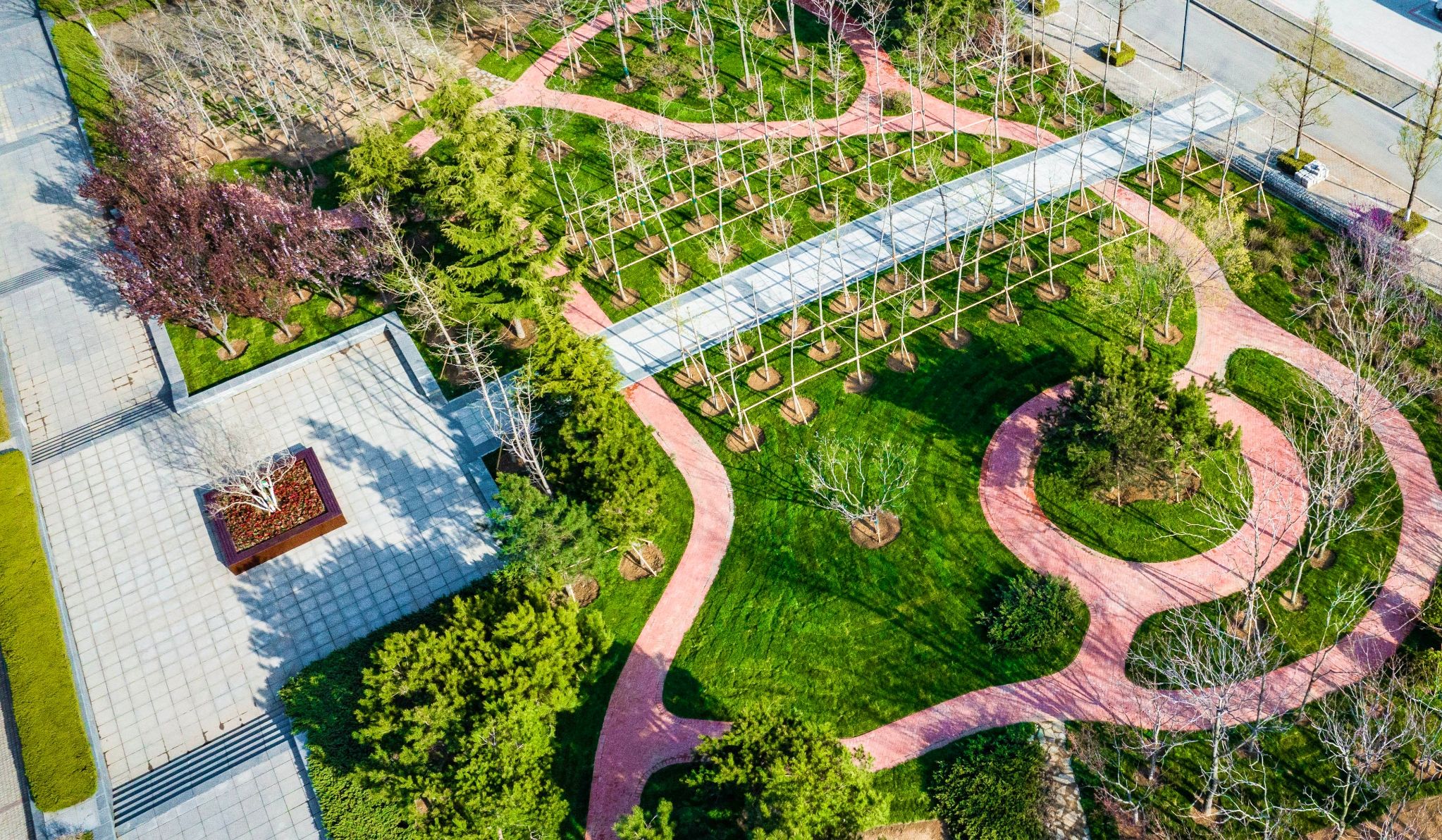 “银杏书韵”景观位于令希图书馆南侧,占地约3000平方米。学校对原有场地进行重塑,以一棵丛生小叶朴树为中心,营造出“朴荫书驿”的意境空间,向南延伸出一条“银杏书韵”主题廊道。廊道两侧整齐排列的银杏树,与周边的黑松、雪松、樱花、紫叶李等共同构成层次丰富的植物景观。人字形铺设的红色园路蜿蜒其间,引导师生漫步书海。园区特别设置了多处休息座椅和停留空间,通过精心搭配的花卉植物,为师生提供了远离喧嚣的思考空间和缤纷多彩的读书花园。