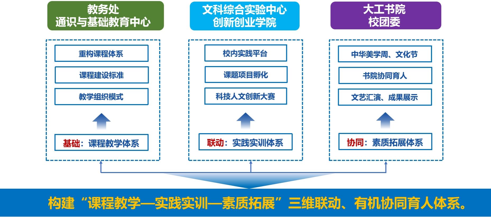 为贯彻落实《中共中央关于进一步全面深化改革、推进中国式现代化的决定》中关于“强化科技教育和人文教育协同”的决策部署,学校制定实施了《大连理工大学人文素质教育工作体系建设方案》,构建“科技赋能人文、人文引领科技”的协同育人体系,出台了《文科综合国家级实验教学示范中心改革方案》,推动党的创新理论与新时代伟大变革成果有机融入教学全过程,培养具备科学素养、人文精神、创新意识和社会责任感的研究型拔尖创新人才,建设了科技教育和人文教育深度融合的课程体系、实践实训体系、素质拓展体系,实现“课堂教学—实践实训—素质拓展”三维联动、有机协同。