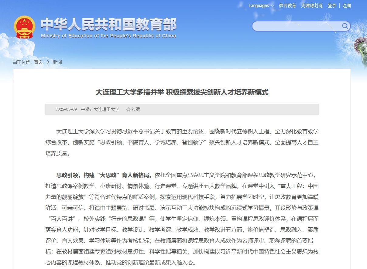 学校深入落实第十七次教育教学研讨会提出的《大连理工大学新时代高质量拔尖创新人才培养实施方案》,创新实施了“思政引领、学域培养、书院育人、主微兼修、智创领学”拔尖创新人才培养新模式,影响力不断扩大。2025年5月,教育部官网以《大连理工大学多措并举 积极探索拔尖创新人才培养新模式》为题报道了学校拔尖创新人才培养的经验举措。学校本科生推免保研率平均超过30%,本科生在国内外高水平大学的深造率超过60%。