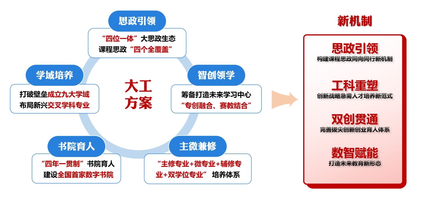 高等教育综合改革试点是教育部贯彻落实教育强国建设规划纲要和教育强国建设三年行动计划的重要战略举措,以人才培养模式和机制创新为切入点,深化教育科技人才一体改革,打造新时代高等教育改革标杆。学校前瞻布局、精心设计,研究制定了《大连理工大学高等教育综合改革试点实施方案》,围绕大思政、新工科、创新创业拔尖人才培养、“四个未来”新形态构建机制等加强建设,统筹推进育人方式、科研范式、办学模式、治理体系等方面综合改革。学校凭借扎实的改革基础、突出的改革实效和完备的改革方案,于2025年12月成为少数以“揭榜挂帅”方式成功入选教育部首批高等教育综合改革试点的高校。