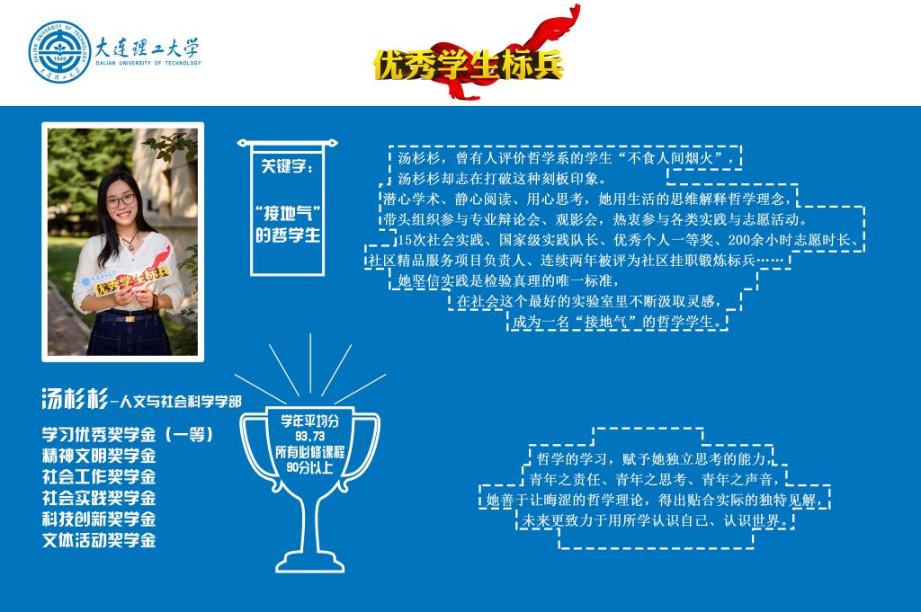 日前,2016-2017学年优秀学生标兵评选结果出炉,让我们一同走近10位荣誉称号获得者,感受榜样的力量。希望全体同学能在优秀榜样的带领下,树立目标,见贤思齐,勇立潮头,传播青春正能量。
