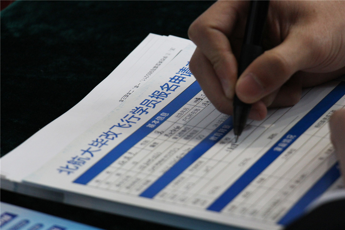 这位求职者高考前空军招飞被淘汰,为了自己的飞行梦,毫不犹豫地填写了民航飞行员报名表。(摄影 于凯笛)