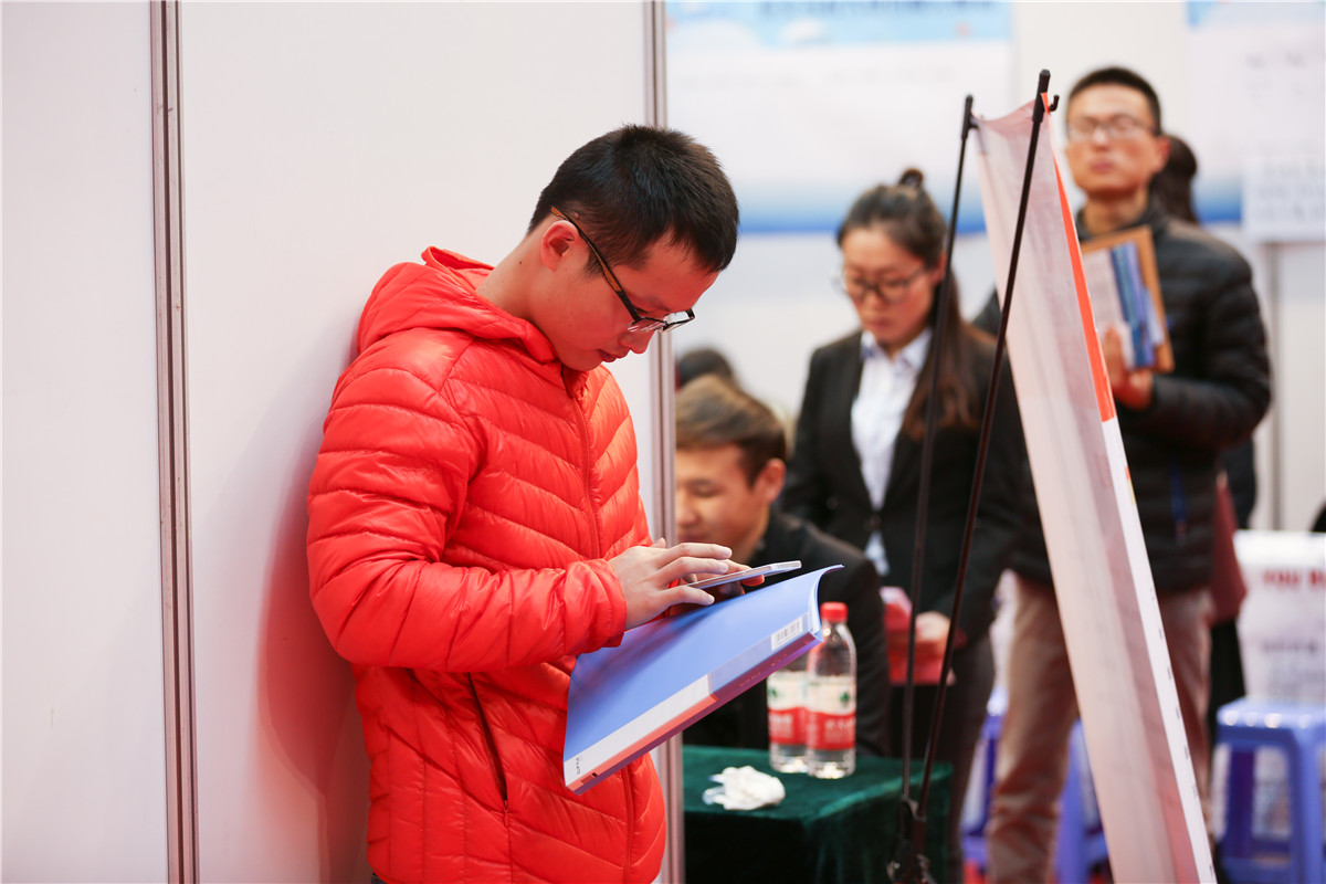 应聘者拿着事先写的企业名单在现场仔细地查找。(摄影 侯彦男)