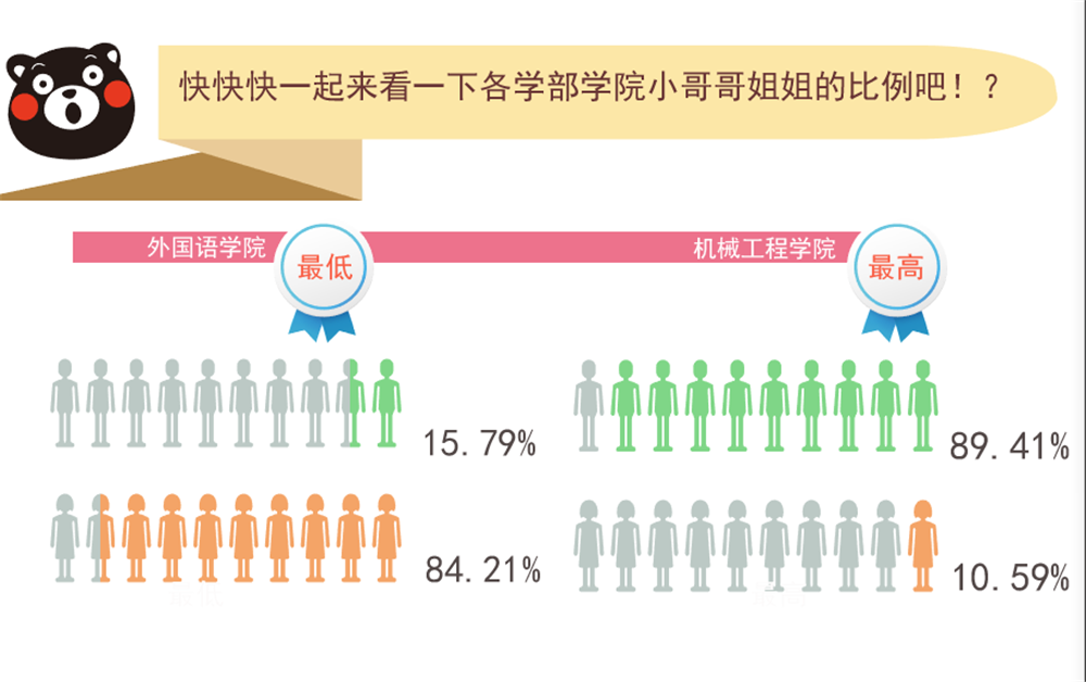 在男女比例的较量中,机械工程学院以接近9:1的男女比例拔得头筹。而外国语学院将这个比例改写成为不到1:5,解锁成就——“男女比例最低学院”。