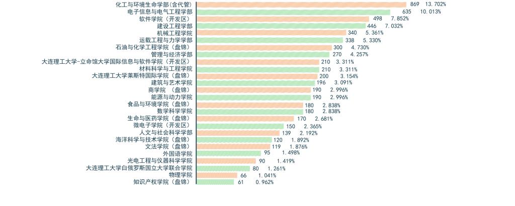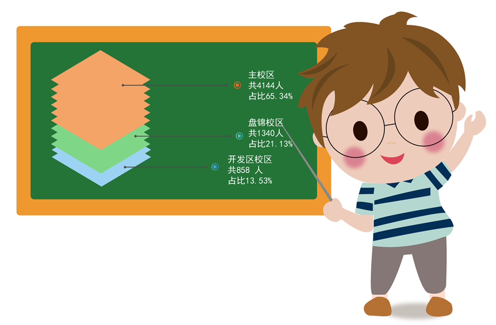 一校两地三区,凌水主校区共4144人,占比65.34%;开发区校区共858人,占比13.53%;盘锦校区共1340人,占比21.13%。