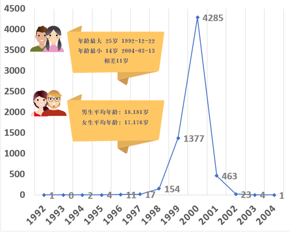 新一届的Duters年龄跨度有11岁哦,最小新生仅14岁,最大新生25岁,但缘分还是让我们共同考入了大工。00后已经成为大工新一代的主力,共占67.57%。有16位鲜肉出生在世纪之交,其中有8位生于2000年12月31日,还有8位生于2001年1月1日。追求梦想与年龄无关,以梦为马,在大工开始!