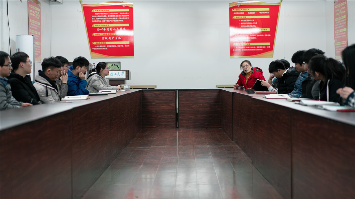 老师带领学生开组会,马跃认真听会,仔细记录笔记。