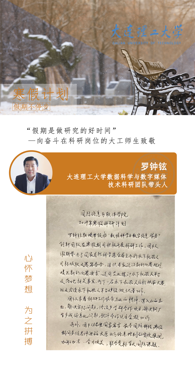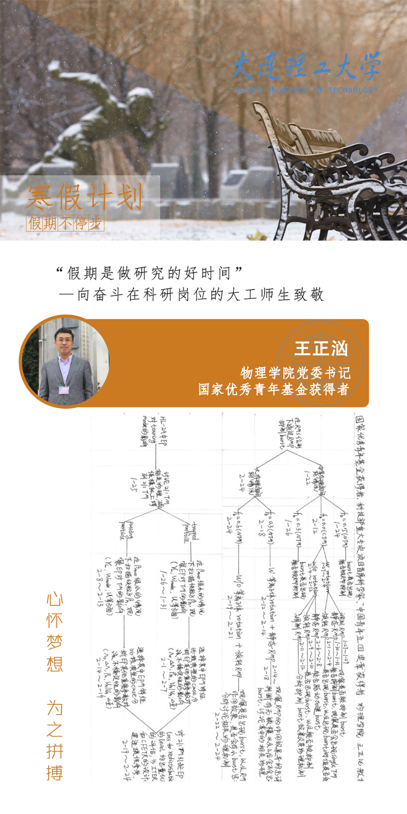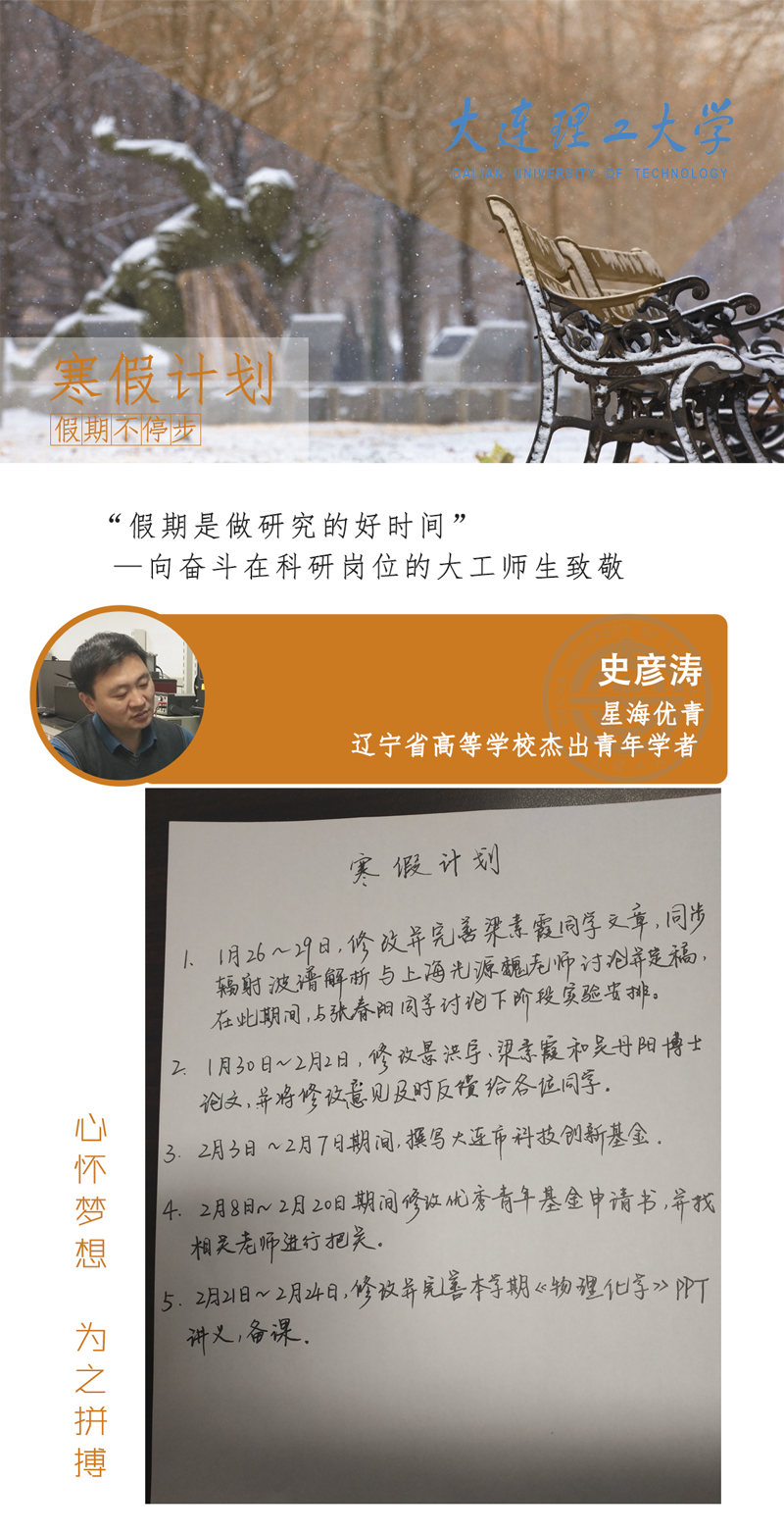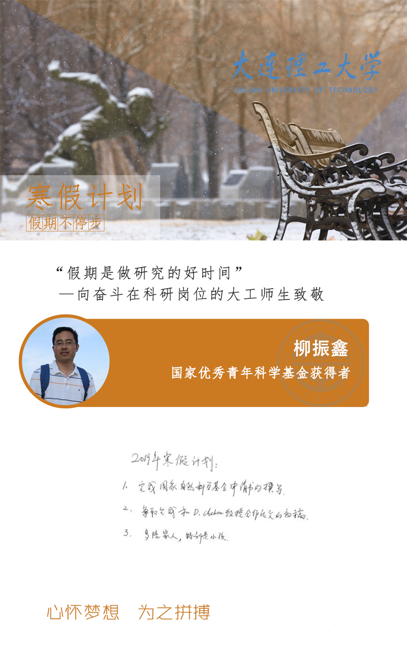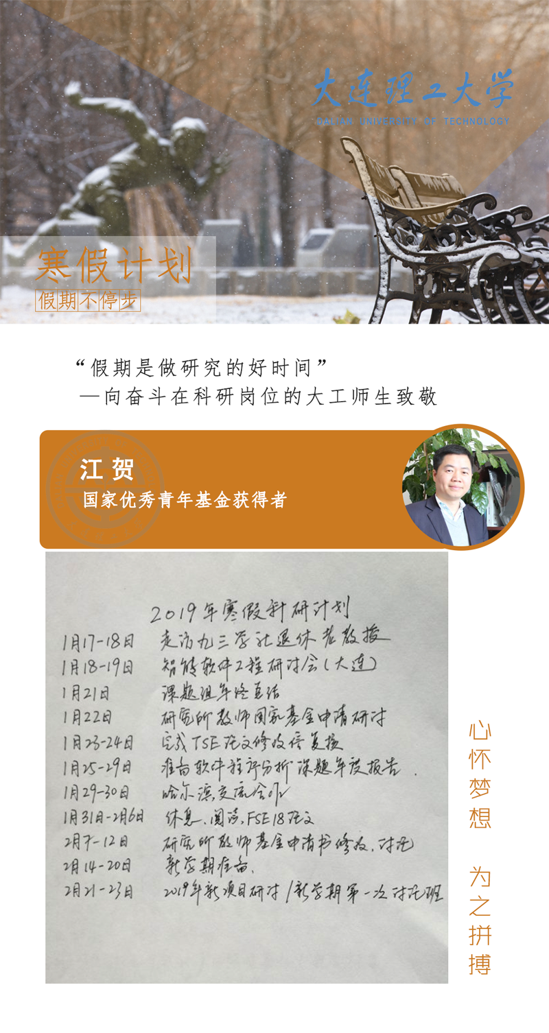 寒假伊始,校园归于平静,而坚守科研岗位的科技工作者们却开始了新的忙碌,他们将安静的假期视为做研究的好时间,计划满满,分秒必争,心怀梦想,为之拼搏。宣传部·新闻中心联合各学部学院征集了部分科技工作者的寒假计划,策划制作组图,谨以此向寒假期间仍奋斗在科研岗位的大工师生致敬!
