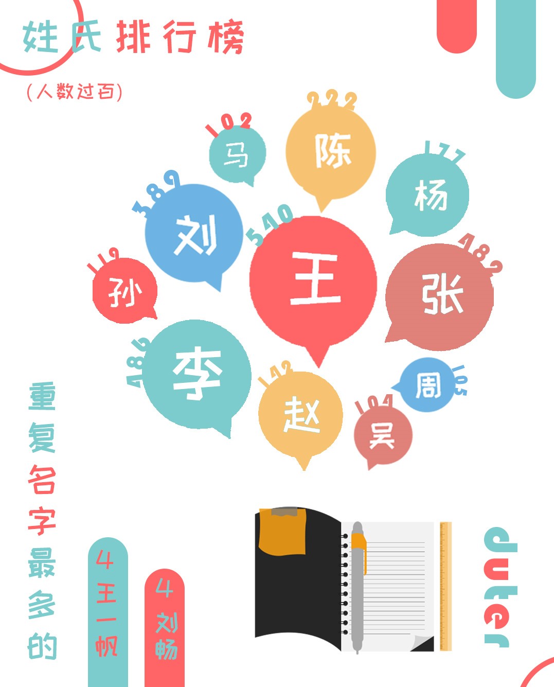 大工姓氏排行榜来啦!大工版百家姓由你们书写,“王李张刘,陈杨赵孙,周吴马”这些姓氏都过百啦!今年的人数之最仍由“王”姓领跑,“李”姓紧随其后。同时我们出现了四个王一帆同学,四个刘畅同学!