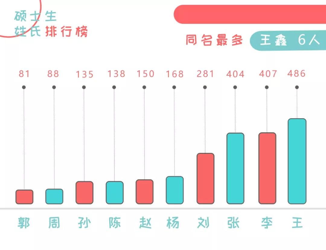 硕士生中依然是“王”姓领跑,值得一提的是,在校园里大吼一声“王鑫”,你最多可能收获 6 声应答,六个人同名同姓同时入学进入大工,实在是奇妙的缘分呐!