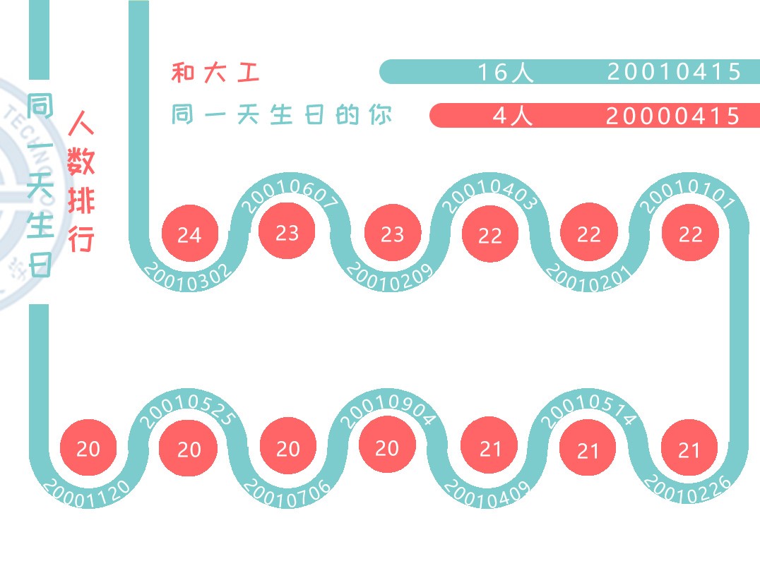 2001年3月2日,24位准Duters出生啦,荣获“产生Duters最多日”,今年一共有20位小萌新和大工生日4月15日同一天!独一无二的你们,与独一无二的大工结缘,多么奇妙的缘分,快来看看有没有和你的生日一样的吧!