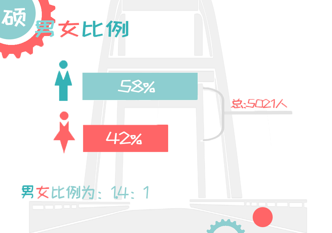今年我们迎来了5936名研究生新同学,其中有5021位硕士研究生同学,915位博士研究生同学。 硕士生方面,从男女比例来看,男生2905人,占录取总人数58%,女生2116人,占录取总人数42%,男女比例约为1.4:1。