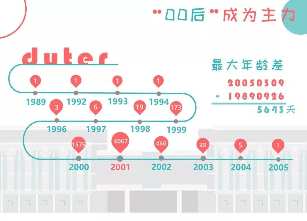 今年萌新们的年龄组成是什么样的呢?从年份上看,2001年出生的小萌新成为主力军,共4067位。年龄最小的萌新仅14岁!最大的为30岁!两人相差5643天!