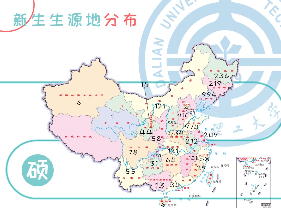 从录取省份来看,辽宁省具有主场优势,本省的萌新共有 1396 人。面朝大海,春暖花开的大工,也吸引着全国各地的同学们,从最南到最北,从最东到最西,全国各地的小鲜肉聚集大工!