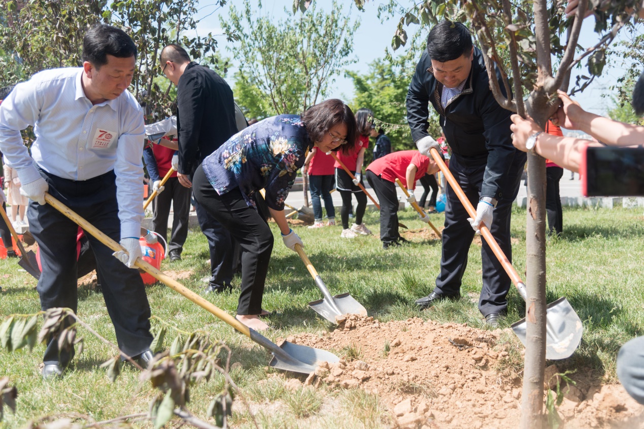 九点刚过,西部校区环境学院楼前就热闹了起来,师生们从四处赶来,他们当中有环境学院领导班子成员、有退休老教师、有学院教师代表、有校友代表、还有研究生及本科生代表,共计70人。学生们穿上了校庆70周年纪念文化衫,老师和校友们则在胸前贴上了70周年校庆标识,每个人的脸上都洋溢着笑容,因为他们将代表环境学院共同种下环境学院的“桃李园”,为母校增添一抹绿色,为70周年校庆献礼。