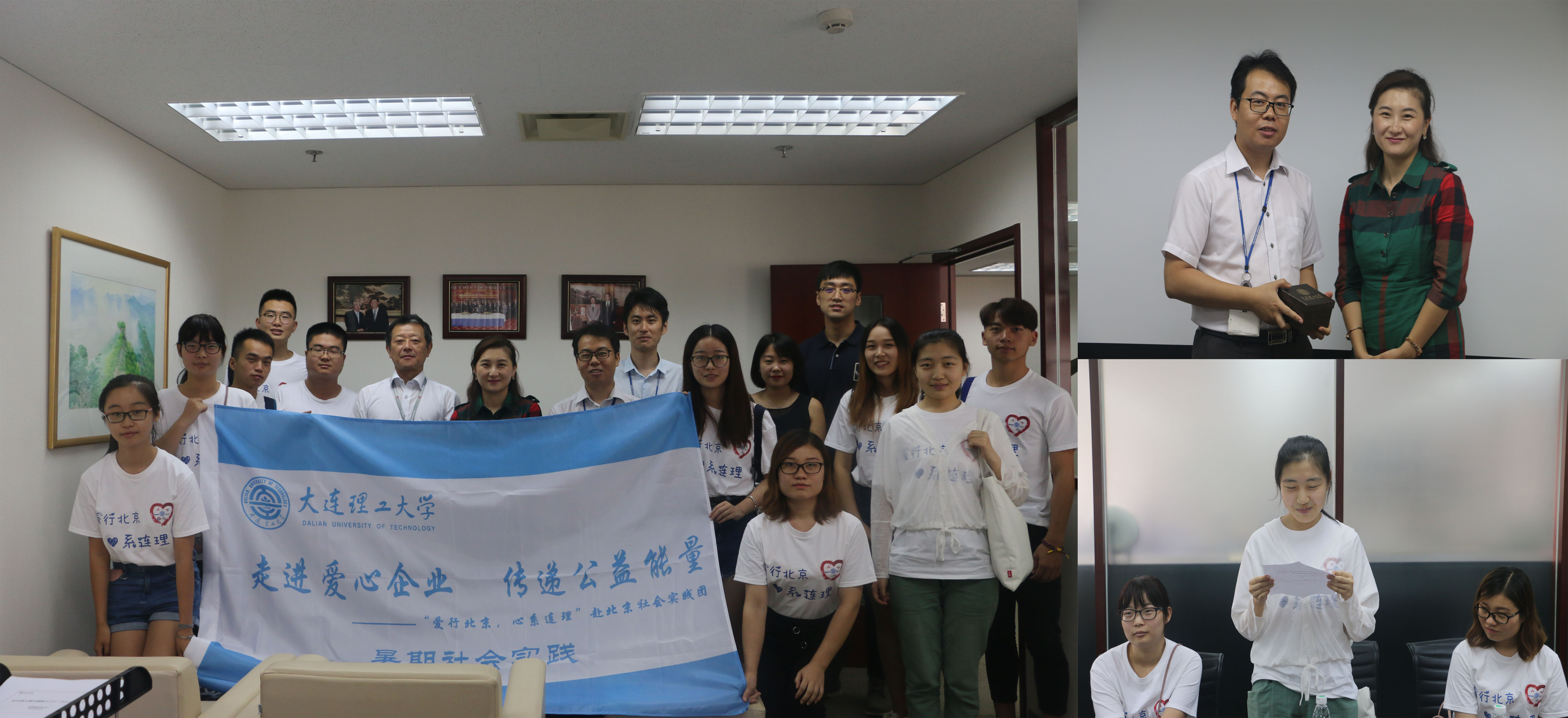 “走进爱心企业 传递公益能量”,8月27日,由校学生工作处副处长金玲,校学生工作处办公室李伟老师,电子信息与电气工程学部辅导员王帅老师带领10名学生组建了赴北京爱心企业行团队,开展了为期4天的参观走访活动,目的在于加强与企业的联系,拓展合作资源,锻炼自身能力,传递大工精神,感恩服务社会。