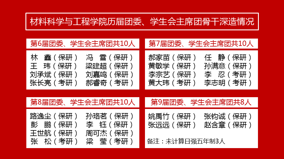 材料科学与工程学院第九届团委、学生会主席团骨干8人,除去五年制日强专业的3人外,保研4人,保研率80%,发展喜人。据了解,材料学院历届团委、学生会主席团骨干保研率均超过50%,深造率为80%。其中,第六届团委、学生会主席团骨干10人,保研6人,深造率80%;第七届团委、学生会主席团骨干10人,保研5人,深造率80%;第八届团委、学生会主席团骨干10人,保研6人,深造率80%。